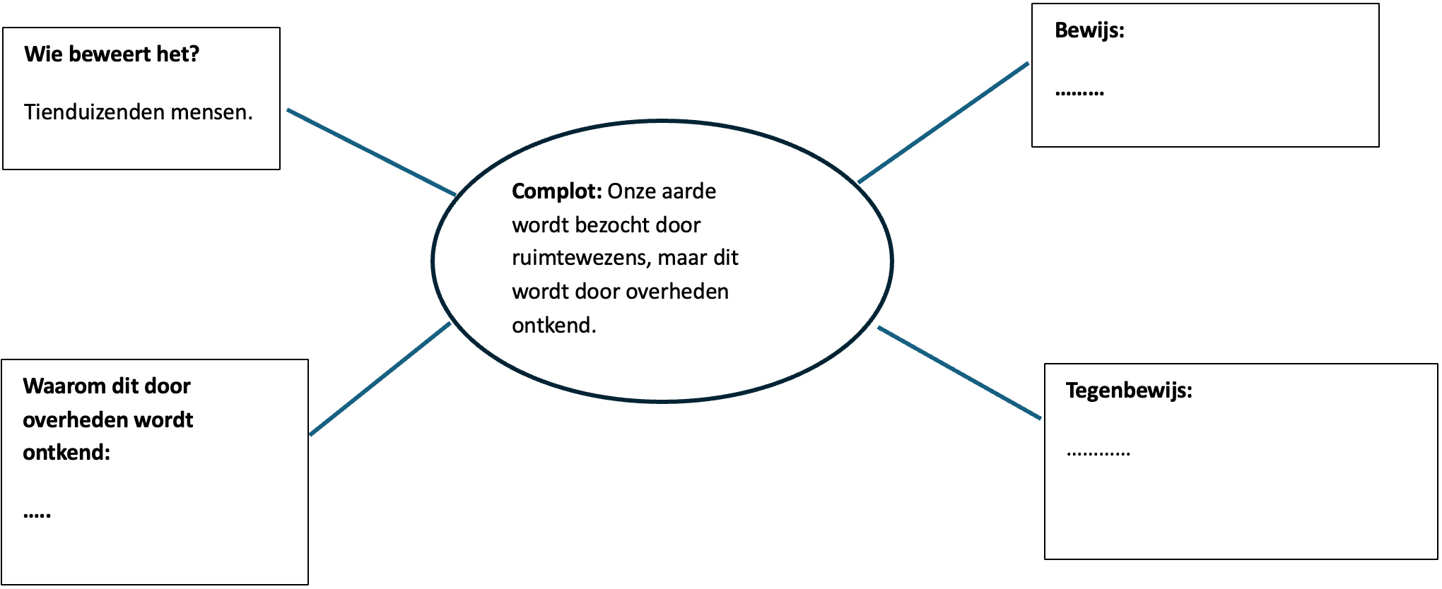 Lees gezamenlijk bladzijde 87, waarop een psycholoog wordt geïnterviewd die gespecialiseerd is in mensen met ufo-ervaringen. Geef de leerlingen vervolgens de opdracht om hun eigen mening te vormen. Wat is nu hun conclusie? Is de complottheorie waar of niet? Laat de leerlingen hun mening onderbouwen met argumenten op basis van de informatie die ze in alle tekstdelen van dit dossier hebben gevonden. Hiervoor zou je een venndiagram kunnen inzetten. De eerste cirkel bestaat uit argumenten uit de tekst, de tweede cirkel uit eigen ideeën/ervaringen en de overlap bestaat uit de conclusie van de leerling.
